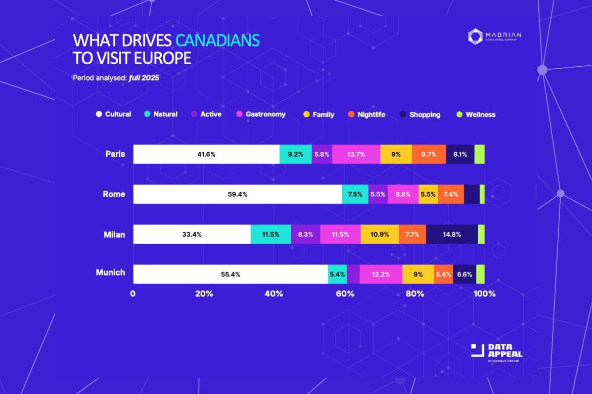 “Several data dimensions show a consistent pattern among Canadian travellers visiting Europe: they tend to favour shoulder seasons over summer, making this market a key driver for European destination strategies aimed at countering seasonality and targeting high-impact long-haul inbound markets,” says Carlos Cendra, Director of Marketing and Communications at Mabrian.